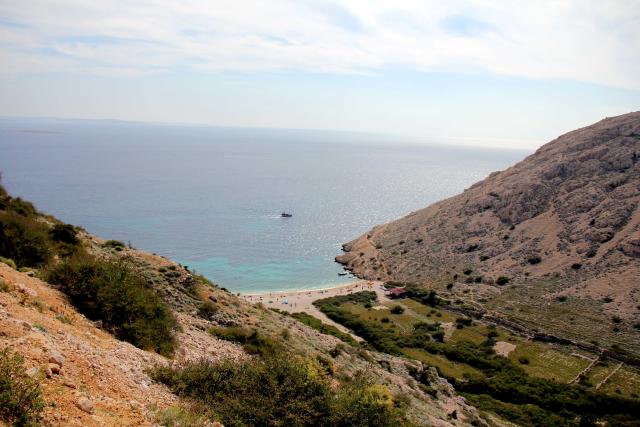 Stara Baška is a small, old touristic town situated on the southwestern part of the island, which belongs to the municipality of Punat. In the Old Baška there are extremely narrow streets, which leads almost trough the peoples yards, but this interesting narrowly constructed town surely has its charm. Name Stara Baska began to be used in the second half of the seventeenth century. Previously, this shepherd’s village was called Kraj or Podkraj, which means Place. Stara Baska is known for its exceptionally clear blue sea and many mighty cliffs that surrounds the whole area. Besides the sheep culture, in old Baška, thanks to a wide range of plants and herbs in the karst terrain, they have also developed beekeeping craft, which helps the locals to produce a quality honey. Stara Baška offers accommodation with apartments, and auto camp Škrila. Stara Baska is different from other parts of the island due to its rather isolated location. In the old days it was accessed only by sea or along the narrow paths over the hill. That was a good place for the refugees who were in Stara Baska hiding from the Turks. Today we can notice that people in this area have different way of speaking and customs, than the rest of the island. In 1980, they paved a road, which today connects the Old Baška with the rest of the island. Follow this road all the way from Punat and you will arrive to the area in front of the camp Škrila, where you will notice a series of cars parked on the left side of the road. These are the cars of people visiting the nearby beach, which is located below the steep road. Tomaž and me visited this beach as well. We parked the car on the road and put the stones under the tires  – so it would not escape. Then we looked at the bay and some kind of pasture surrounded by a stone wall. We of course noticed the graffiti, made of rocks on the grassy ground. Obviously someone wanted to show her how much they love someone, and created a big sign from rocks I LOVE … which can be seen from the top of the road. Someone had to be first, because today it has obviously became a tradition. The whole area is filled with various stone inscriptions like: I love you, names, peace signs and things like that. After we took photos of the bay and graffiti we went over the fence into a steep valley all the way to the blue bay. On the way you have to be careful, because it can quickly happen, that you slip on this red earth and rocks. This bay is strongly visited by tourists so it is quite crowded, on the beach there is also a small hut with tables where you can order a drink or rent a pedal boat.