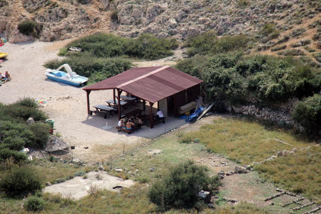 Stara Baška is a small, old touristic town situated on the southwestern part of the island, which belongs to the municipality of Punat. In the Old Baška there are extremely narrow streets, which leads almost trough the peoples yards, but this interesting narrowly constructed town surely has its charm. Name Stara Baska began to be used in the second half of the seventeenth century. Previously, this shepherd’s village was called Kraj or Podkraj, which means Place. Stara Baska is known for its exceptionally clear blue sea and many mighty cliffs that surrounds the whole area. Besides the sheep culture, in old Baška, thanks to a wide range of plants and herbs in the karst terrain, they have also developed beekeeping craft, which helps the locals to produce a quality honey. Stara Baška offers accommodation with apartments, and auto camp Škrila. Stara Baska is different from other parts of the island due to its rather isolated location. In the old days it was accessed only by sea or along the narrow paths over the hill. That was a good place for the refugees who were in Stara Baska hiding from the Turks. Today we can notice that people in this area have different way of speaking and customs, than the rest of the island. In 1980, they paved a road, which today connects the Old Baška with the rest of the island. Follow this road all the way from Punat and you will arrive to the area in front of the camp Škrila, where you will notice a series of cars parked on the left side of the road. These are the cars of people visiting the nearby beach, which is located below the steep road. Tomaž and me visited this beach as well. We parked the car on the road and put the stones under the tires  – so it would not escape. Then we looked at the bay and some kind of pasture surrounded by a stone wall. We of course noticed the graffiti, made of rocks on the grassy ground. Obviously someone wanted to show her how much they love someone, and created a big sign from rocks I LOVE … which can be seen from the top of the road. Someone had to be first, because today it has obviously became a tradition. The whole area is filled with various stone inscriptions like: I love you, names, peace signs and things like that. After we took photos of the bay and graffiti we went over the fence into a steep valley all the way to the blue bay. On the way you have to be careful, because it can quickly happen, that you slip on this red earth and rocks. This bay is strongly visited by tourists so it is quite crowded, on the beach there is also a small hut with tables where you can order a drink or rent a pedal boat.