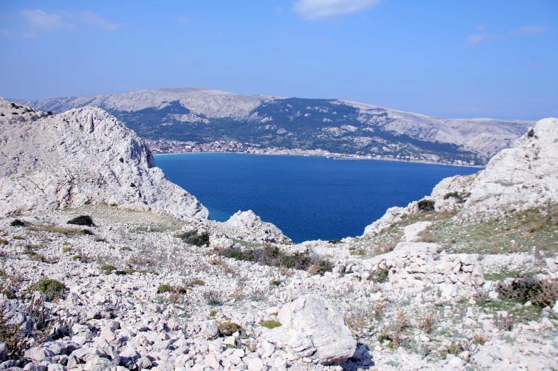 If you are planning to visit island Krk and you would like to combine the enjoyment on the beach with a short hike, I recommend you to go on a rout towards Bay Vela Draga. Because our goal was to explore the most interesting and hidden corners, that are usually not really known to tourists, we decided to explore the path towards Bay Vela Draga. If you are looking towards the sea, on the right side, towards the edge of the most famous Baška beach, is the start of the route. You climb a little hill that leads pass the “free ride” area, which is great for jumping with cross-country bikes – as we were told by young boys who were editing the area. While you pass that, you continue your route through this beautiful pine forest, all the way to rocky slopes, which holds a spectacular view on the town of Baška. I assure you that you will be fascinated by the dark blue sea and majestic cliffs, which you will see at the beginning of the path. Soon you will go through the shepherd door, and then climb towards a bit steeper and more rocky area, on which you will hike for a few minutes. Once you will reach the top, you will see a signpost that will show you the way towards Bay Vela Draga, which is about 3km away from that point. If you will look back on this point you are going to see the rocky area overlooking the sea. The path you’re about to walk on is a bit different. In front of you there will be a more shepherd area with some stone built scarps, which protects the land from the wind. In the distance, along the way, you will notice a lighthouse on the island Prvić,as well as some other directions, which are there to explore. The trail is well marked. Very soon we came to the next signpost, which showed us the way towards Bay Vela Draga and its beach, which was about 1km away. We were looking into the bay and excitingly getting closer and closer to the beach. View of the bay was wonderful. On the beach someone toyed with the rocks and created some kind of sign, that looked pretty interesting from the top. On the right side of the beach, if you look towards the sea there are two kind of half-demolished houses, built of stone. Visitors like to use them as a dressing room or for drying clothes.