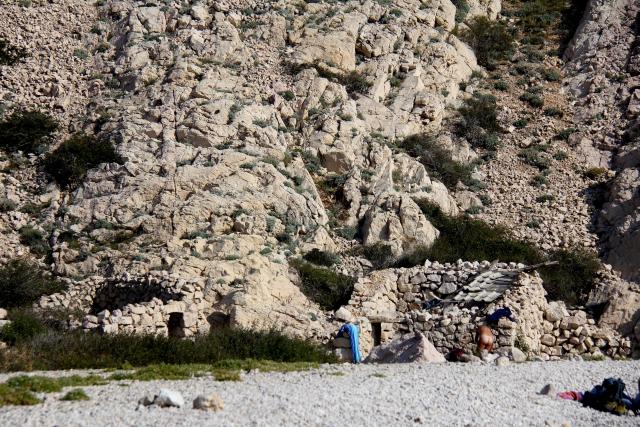 If you are planning to visit island Krk and you would like to combine the enjoyment on the beach with a short hike, I recommend you to go on a rout towards Bay Vela Draga. Because our goal was to explore the most interesting and hidden corners, that are usually not really known to tourists, we decided to explore the path towards Bay Vela Draga. If you are looking towards the sea, on the right side, towards the edge of the most famous Baška beach, is the start of the route. You climb a little hill that leads pass the “free ride” area, which is great for jumping with cross-country bikes – as we were told by young boys who were editing the area. While you pass that, you continue your route through this beautiful pine forest, all the way to rocky slopes, which holds a spectacular view on the town of Baška. I assure you that you will be fascinated by the dark blue sea and majestic cliffs, which you will see at the beginning of the path. Soon you will go through the shepherd door, and then climb towards a bit steeper and more rocky area, on which you will hike for a few minutes. Once you will reach the top, you will see a signpost that will show you the way towards Bay Vela Draga, which is about 3km away from that point. If you will look back on this point you are going to see the rocky area overlooking the sea. The path you’re about to walk on is a bit different. In front of you there will be a more shepherd area with some stone built scarps, which protects the land from the wind. In the distance, along the way, you will notice a lighthouse on the island Prvić,as well as some other directions, which are there to explore. The trail is well marked. Very soon we came to the next signpost, which showed us the way towards Bay Vela Draga and its beach, which was about 1km away. We were looking into the bay and excitingly getting closer and closer to the beach. View of the bay was wonderful. On the beach someone toyed with the rocks and created some kind of sign, that looked pretty interesting from the top. On the right side of the beach, if you look towards the sea there are two kind of half-demolished houses, built of stone. Visitors like to use them as a dressing room or for drying clothes.