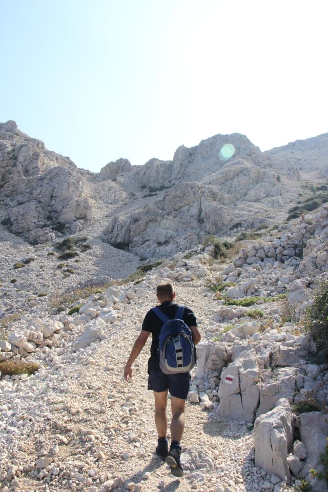 If you are planning to visit island Krk and you would like to combine the enjoyment on the beach with a short hike, I recommend you to go on a rout towards Bay Vela Draga. Because our goal was to explore the most interesting and hidden corners, that are usually not really known to tourists, we decided to explore the path towards Bay Vela Draga. If you are looking towards the sea, on the right side, towards the edge of the most famous Baška beach, is the start of the route. You climb a little hill that leads pass the “free ride” area, which is great for jumping with cross-country bikes – as we were told by young boys who were editing the area. While you pass that, you continue your route through this beautiful pine forest, all the way to rocky slopes, which holds a spectacular view on the town of Baška. I assure you that you will be fascinated by the dark blue sea and majestic cliffs, which you will see at the beginning of the path. Soon you will go through the shepherd door, and then climb towards a bit steeper and more rocky area, on which you will hike for a few minutes. Once you will reach the top, you will see a signpost that will show you the way towards Bay Vela Draga, which is about 3km away from that point. If you will look back on this point you are going to see the rocky area overlooking the sea. The path you’re about to walk on is a bit different. In front of you there will be a more shepherd area with some stone built scarps, which protects the land from the wind. In the distance, along the way, you will notice a lighthouse on the island Prvić,as well as some other directions, which are there to explore. The trail is well marked. Very soon we came to the next signpost, which showed us the way towards Bay Vela Draga and its beach, which was about 1km away. We were looking into the bay and excitingly getting closer and closer to the beach. View of the bay was wonderful. On the beach someone toyed with the rocks and created some kind of sign, that looked pretty interesting from the top. On the right side of the beach, if you look towards the sea there are two kind of half-demolished houses, built of stone. Visitors like to use them as a dressing room or for drying clothes.
