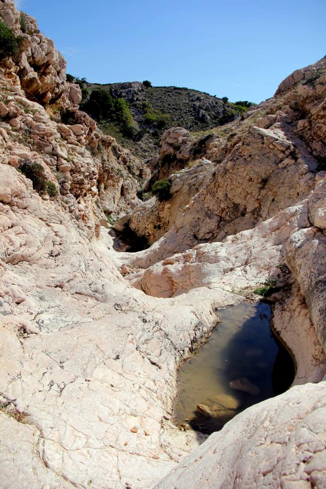 We went down the rocky slope and arrived to out destination. Vela Luka bay awaits you with a wonderful beach and an inn called Pečenjara, in which you can refresh yourself, hire a deckchair, umbrellas or rent a pedal boat. You can as well rent a taxi boat, which can take you back to Baška by sea. We decided to head toward another kilometer and visit the Mala Luka bay. On the way there, we met a large lizard and flock of sheep that were hiding in a shade under the fig tree. We continued our way on this almost a little desert path which took us into the bay of Mala Luka, which had a special shepherd’s mountain charm. In a sheep company  we relaxed on the lawn and went swimming in the bay. When our legs rested enough we decided to go back. While we were there we as well climbed the nearby hill named Corinthia, which honored us with a beautiful view of both bays. Corinthia used to be an ancient village, which was apparently after the Second World War, overgrown with vines. Today this is more difficult to imagine, since the landscape is all rocky. When we were going back, we decided that we will return on a different path, so we went towards canyon named Vrženica. That was in my opinion the most interesting and fun part of the journey, as it was necessary to use some climbing skills, jumping and testing our swiftness, of course, caution was appropriate.  The canyon is about 2.5 kilometers long, so at that time you conquer the obstacles the best way you can, and at the end of it you arrive in a forest of nicely smelling pines. This strong pleasant aroma accompanies you all the way toward the beautiful beach. The path continues on the seaside, where you cross different bays with crystal clear water, which is inviting you to swim and rest a bit after you hike.